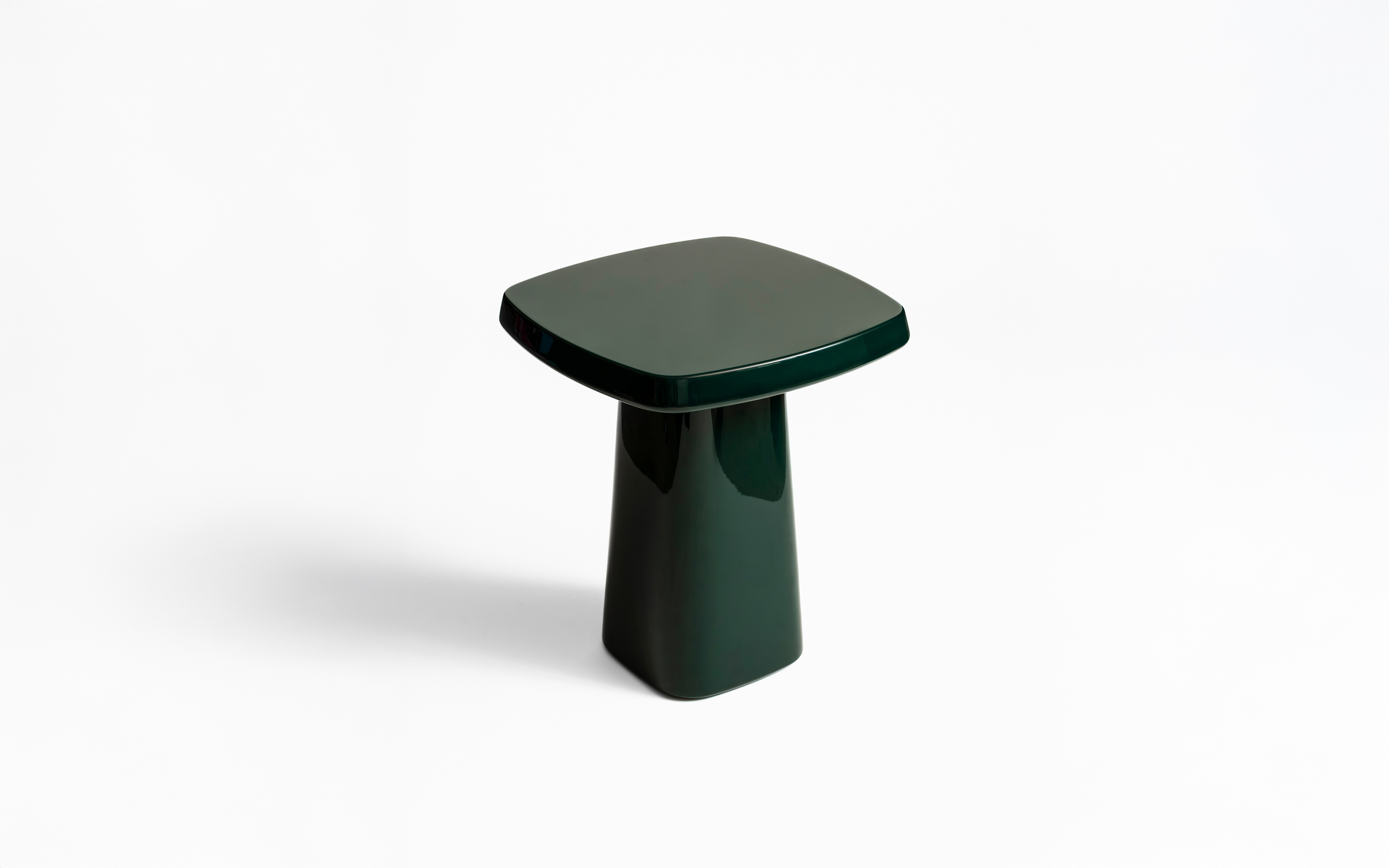Side table with soft forms, perfectly proportioned to ground any setting. Features a powder coated aluminum mounting plate and inset cork floor pad.